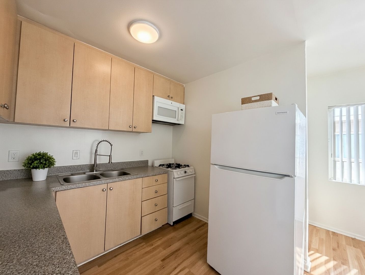 • Updated kitchen with light wood cabinets, speckled countertops, full-size refrigerator, gas stove, and over-the-range microwave