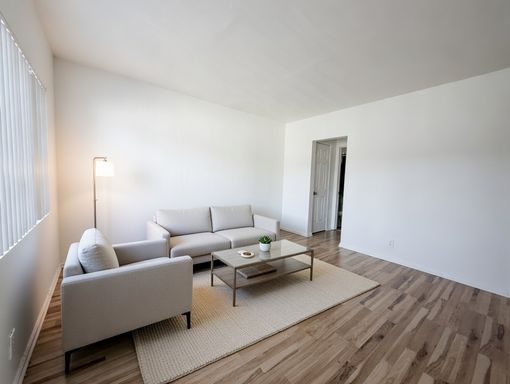 • Open living area with large windows and vertical blinds for abundant natural light