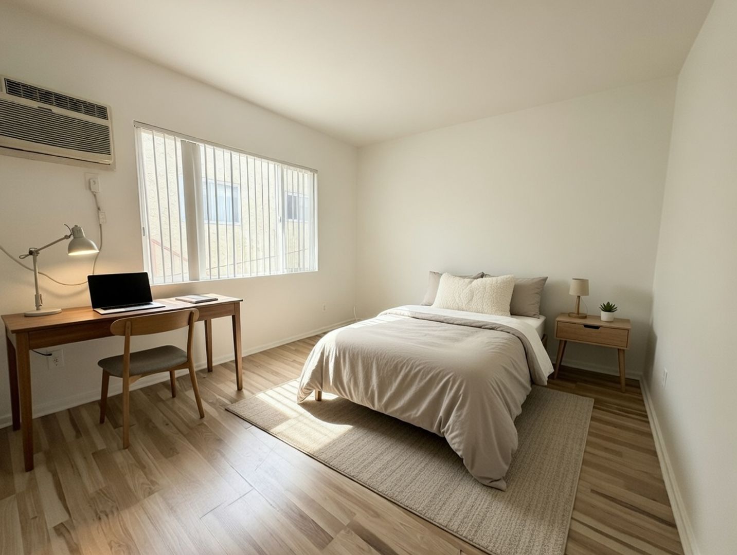 • Spacious bedroom with wall-mounted AC unit and room for a desk