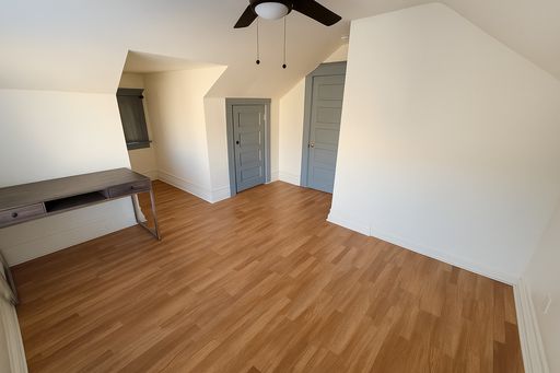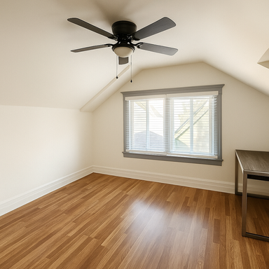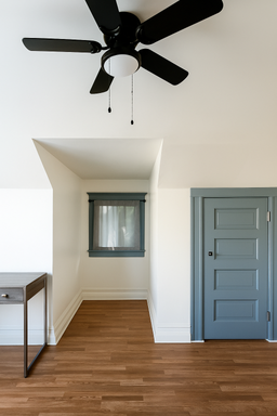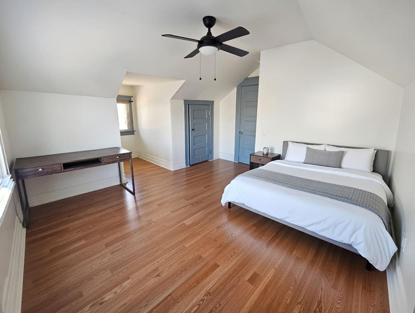 Spacious Private Bedroom with warm hardwood-style floors, ample natural lighting, and sleek gray trim for a contemporary touch