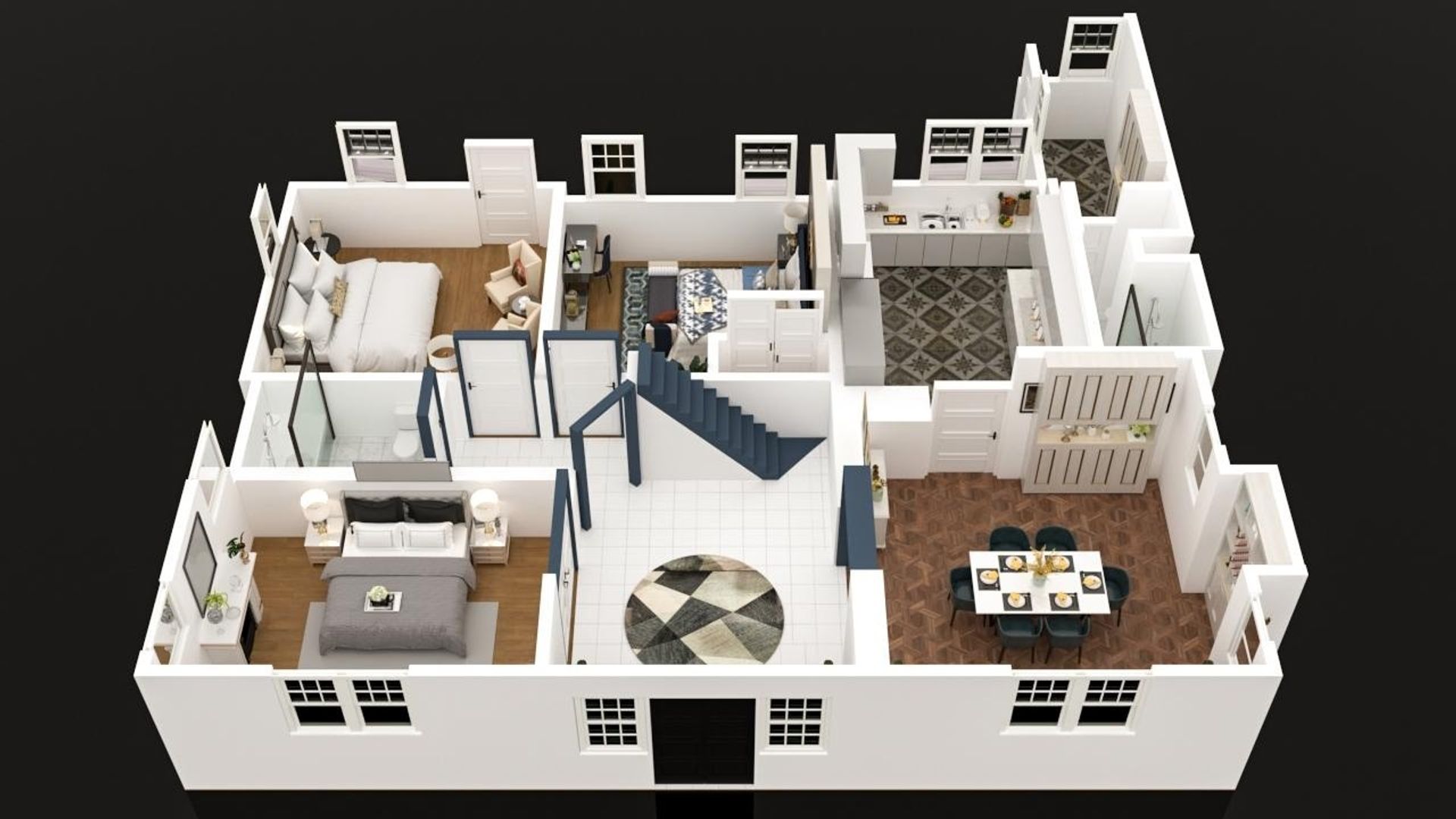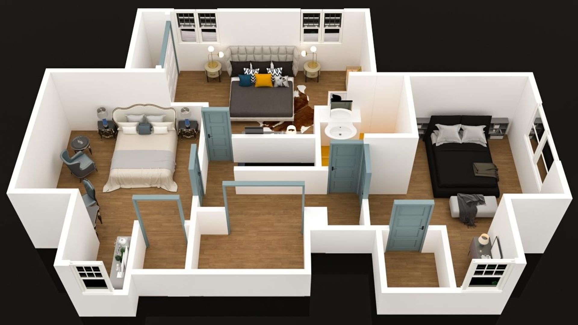 Spacious Private Bedroom with warm hardwood-style floors, ample natural lighting, and sleek gray trim for a contemporary touch